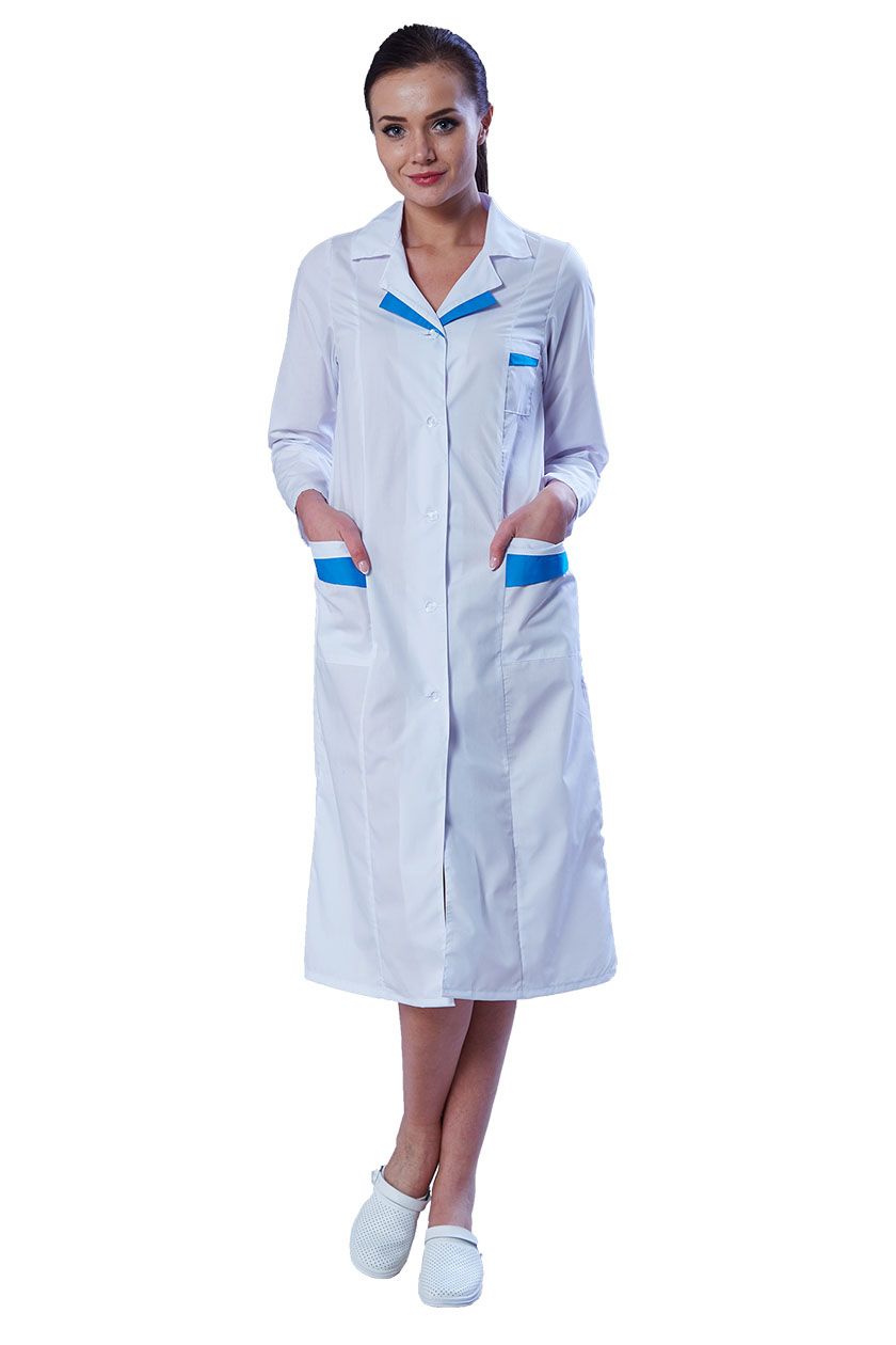 Халат с центральной бортовой застежкой на пуговицы. Полочки с рельефами от линии плеча, с одним нагрудным и двумя нижними накладными карманами. Спинка с хлястиком. Рукава втачные одношовные. Воротник отложной, с лацканами с декоративными деталями. На карманах декоративные детали.