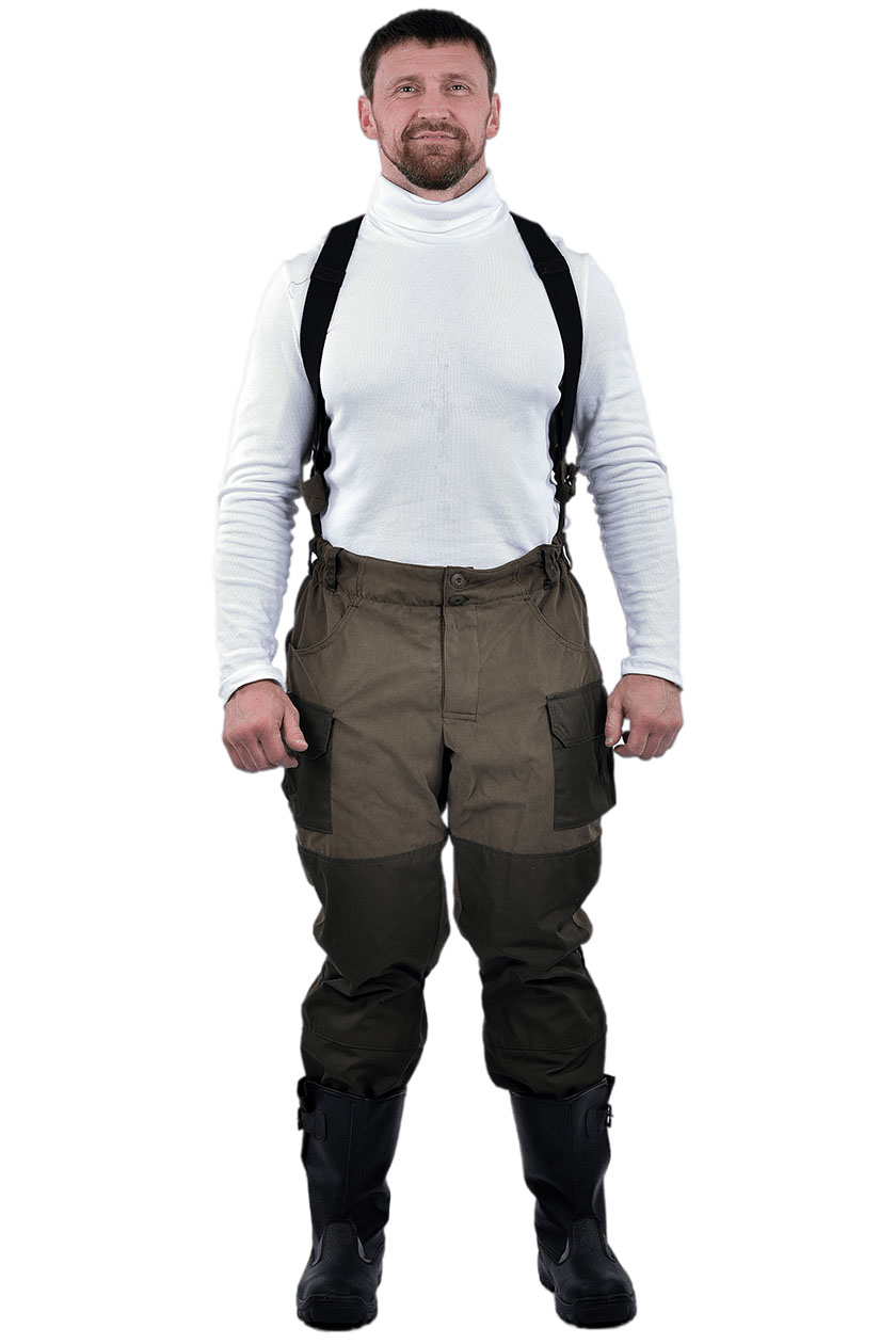 В области сидения задней половинки, на уровне колена на передней половинке и по низу брюк расположены накладки от истирания. Брюки с кулисой ниже колена на задней половинке и низ брюк стянутой эластичной лентой. По низу брюк с изнанки притачен напульсник из бязи с завязками для фиксации по ноге.