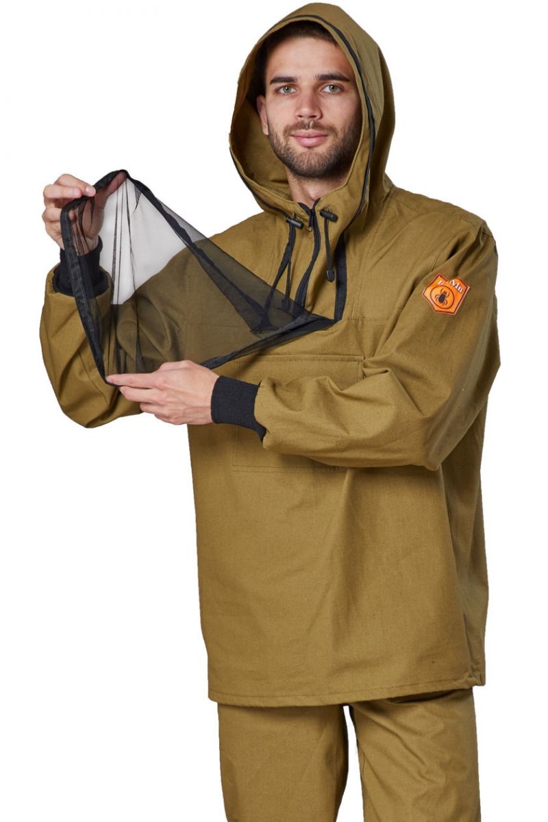 ➠ Куртка прямого силуэта с отрезными кокетками полочки, с капюшоном сложной конструкции, исключающей проникновение насекомых под одежду. Капюшон с противомоскитной сеткой. Низ куртки стягивается эластичным шнуром с фиксатором. Рукава втачные, с трикотажными манжетами-напульсниками. Полочка с накладным карманом с клапаном. В шве притачивания капюшона к полочке выполнен внутренний карман для противомоскитной сетки.