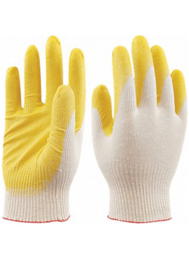 Рабочие трикотажные, хлопчатобумажные перчатки с одинарным покрытием слоем латекса на ладони.