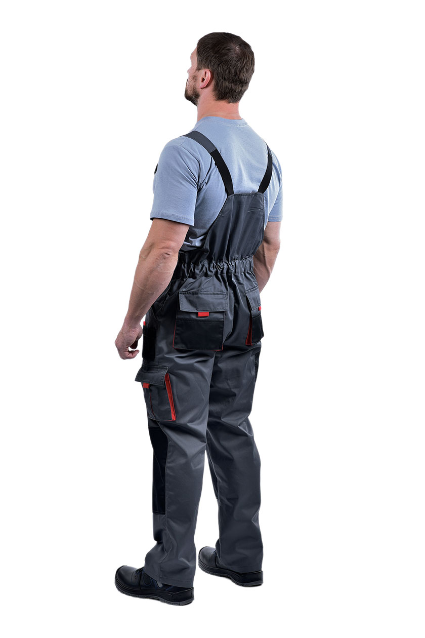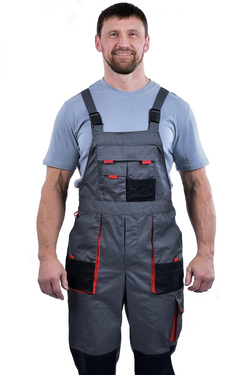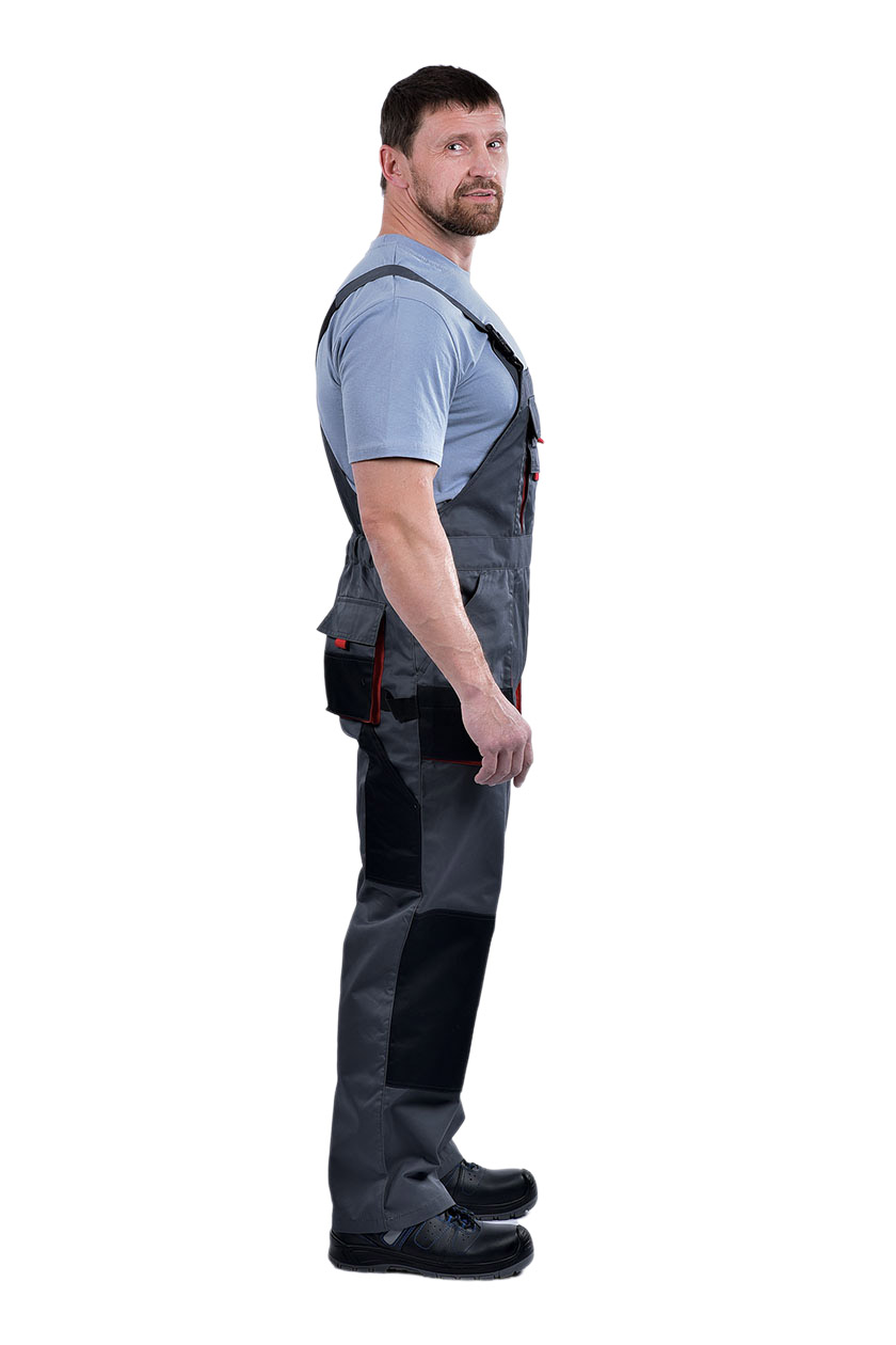 Застежки по бокам на пуговицы. Многочисленные объемные карманы. Усилительные накладки в области коленей.