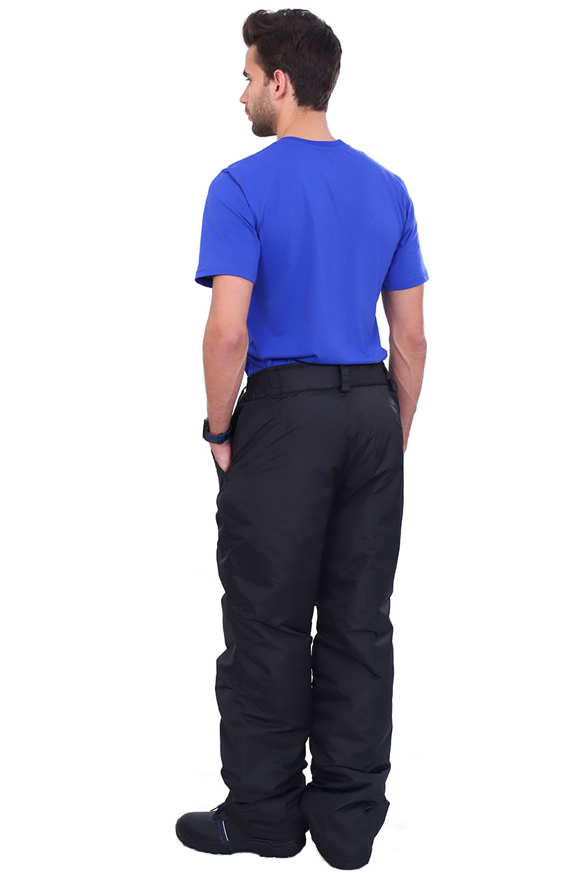 Брюки мужские утепленные прямые с широким притачным поясом, частично на резинке, с пятью шлёвками. Два боковых кармана, застёжка гульфа на молнию. По низу брюк внутри снегозащитная муфта.